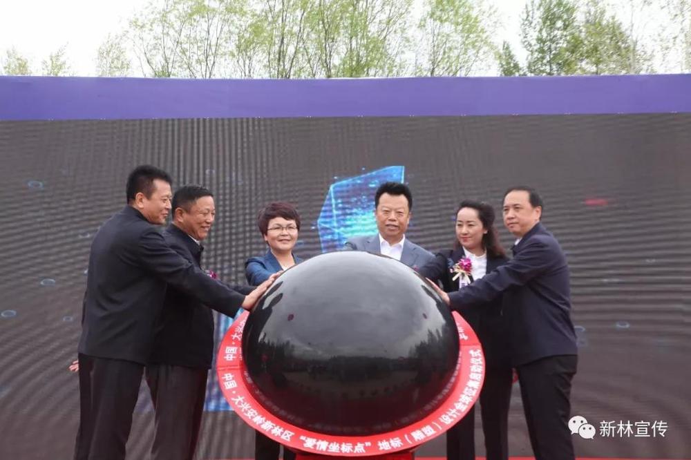 图为相关领导共同开启中国·365777.com新林“爱情坐标点”地标(雕塑)全球征集设计启动球 徐晶 摄