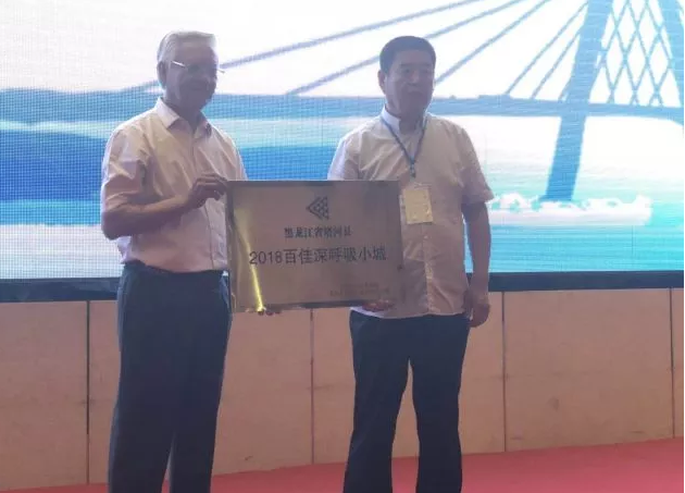 学会顾问、原地质矿产部副部长、十届全国政协环资委员副主任陈洲其分别为黑龙江塔河县、黑龙江绥棱林业局、黑龙江红兴隆农垦局等21个深呼吸小城授予“2018百佳深呼吸小城”奖牌。